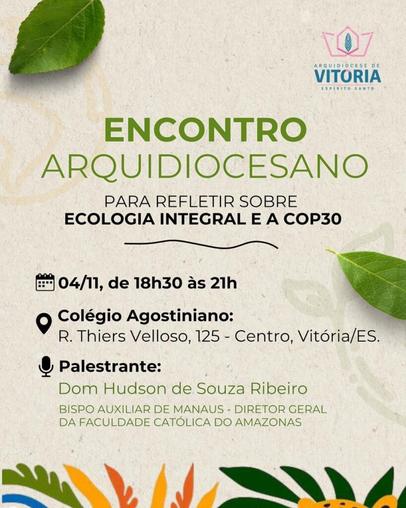 No próximo dia 04 de novembro de 18h30 às 21h, a Arquidiocese de Vitória promove um encontro de lideranças com dom Joaquim Hudson de Souza Ribeiro, bispo auxiliar de Manaus para conversar sobre Ecologia Integral e a COP30, temas interconectados pelo grande tema que são as mudanças climáticas e a necessidade de cuidar do planeta, que o Papa Francisco chamou de Casa Comum.