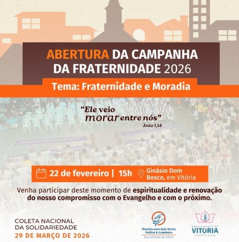 No próximo domingo, 22 de fevereiro de 2026, a Arquidiocese de Vitória faz a Abertura da Campanha da Fraternidade. A partir de 15h no Ginásio Dom Bosco em Vitória, cristãos e especialmente os católicos estão convidados a comparecer para juntos iniciarmos o Tempo da Quaresma. O tema da Campanha é um motivo que nos guia […]
